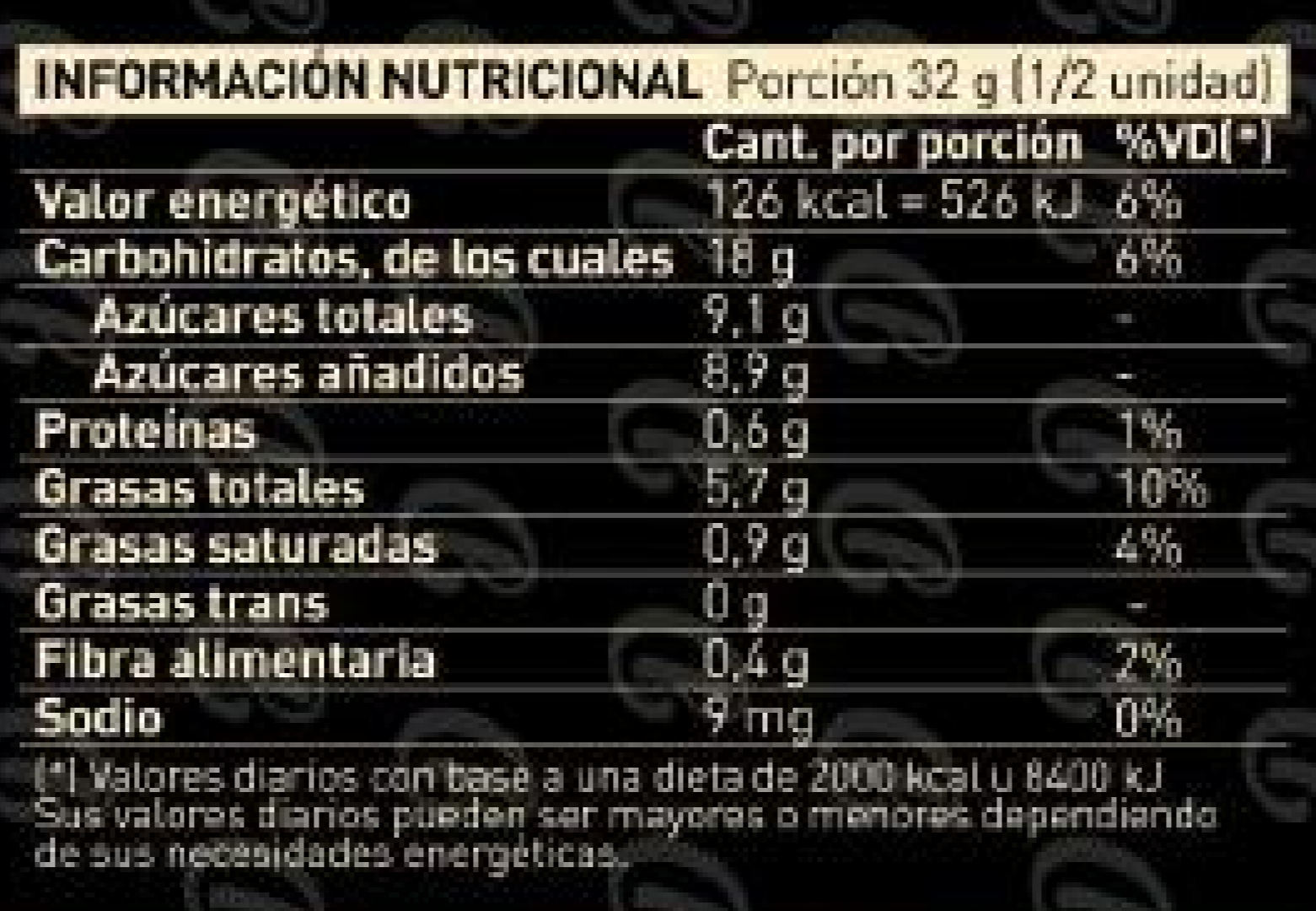 Ingredientes: Pasta de café, chocolate semiamargo cobertura, fécula de maíz, azúcar, aceite vegetal interesterificado, harina de arroz, fécula de mandioca, pasta de avellanas, harina de almendra, agua, miel, JMAF, yema deshidratada, leche entera deshidratada, goma xántica, sabor vainilla, sabor almendra, CONS: INS 282, EMU: INS 322, AGREG: INS (500ii, 503ii). CONTIENE ALMENDRA, AVELLANA, HUEVO, LECHE Y DERIVADOS DE SOJA. PUEDE CONTENER MANİ Y SULFITOS.