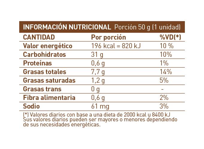 Ingredientes: Pasta de avellanas (Agua, cacao en polvo, almidón, azúcar, JMAF, sal, esencia natural de avellana, CONS: INS 202, ESP: INS 406), fécula de maíz, chocolate semiamargo cobertura, aceite vegetal interesterificado, azúcar, harina de arroz, agua, mezcla de emulsionantes, JMAF, cacao en polvo, sal, esencia natural de vainilla, esencia natural de almendra, ACREG 500ii, 503ii, CONS 202, 282, EMU 322, ESP 415. CONTIENE ALMENDRA, AVELLANA Y DERIVADOS DE SOJA. PUEDE CONTENER MANÍ, HUEVO, LECHE Y SULFITOS.
