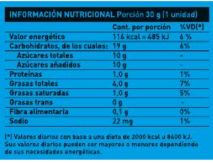 Ingredientes: Dulce de leche (leche entera, azúcar, glucosa, sólidos lácteos, almidón, estabilizante (agar), regulador de acidez (bicarbonato de sodio), aromatizante (sabor vainilla), conservante (sorbato de potasio), fécula de maíz, azúcar, aceite vegetal interesterificado, harina de arroz, fécula de mandioca, agua, miel, JMAF, leche entera deshidratada, yema deshidratada, goma xántica, sal, sabor vainilla, sabor naranja, CONS: INS 282, EMU: INS 322, ACREG: INS (500ii, 503ii). CONTIENE HUEVO, LECHE Y DERIVADOS DE SOJA. PUEDE CONTENER ALMENDRA, AVELLANA, MANÍ Y SULFITOS.